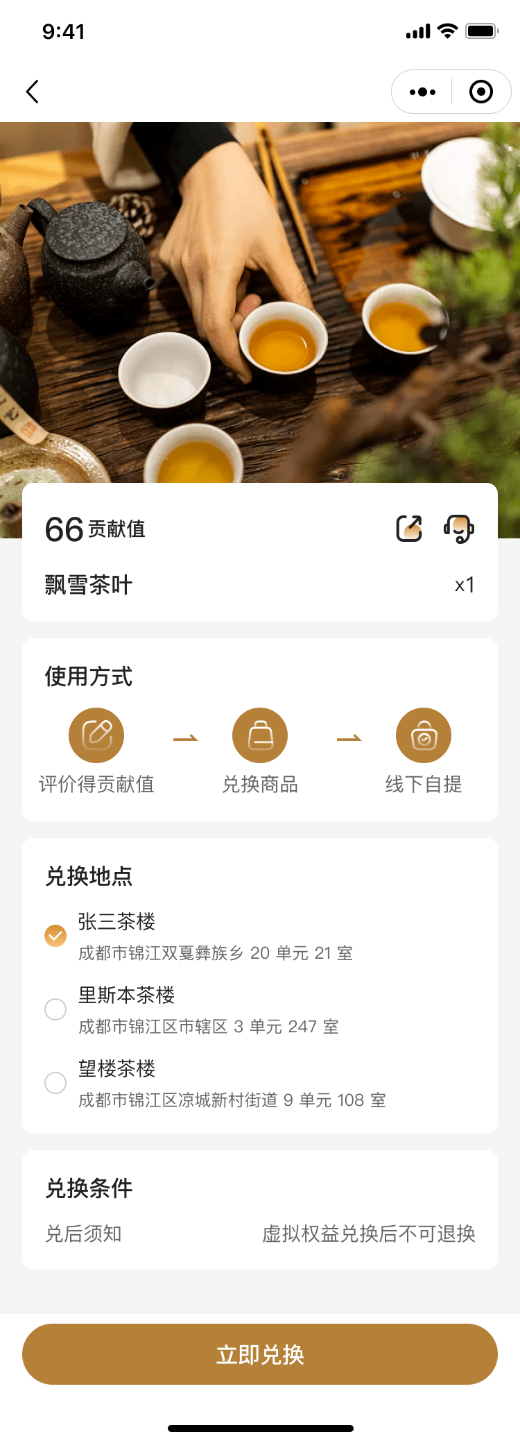 为了回馈广大用户,茶馆预约小程序特设积分兑换功能。用户在预约喝茶、参与活动等方面均可获得积分,积分可兑换茶馆优惠券、茶品、周边产品等。通过积分兑换,用户在品茶的同时,还能享受到更多实惠和惊喜。