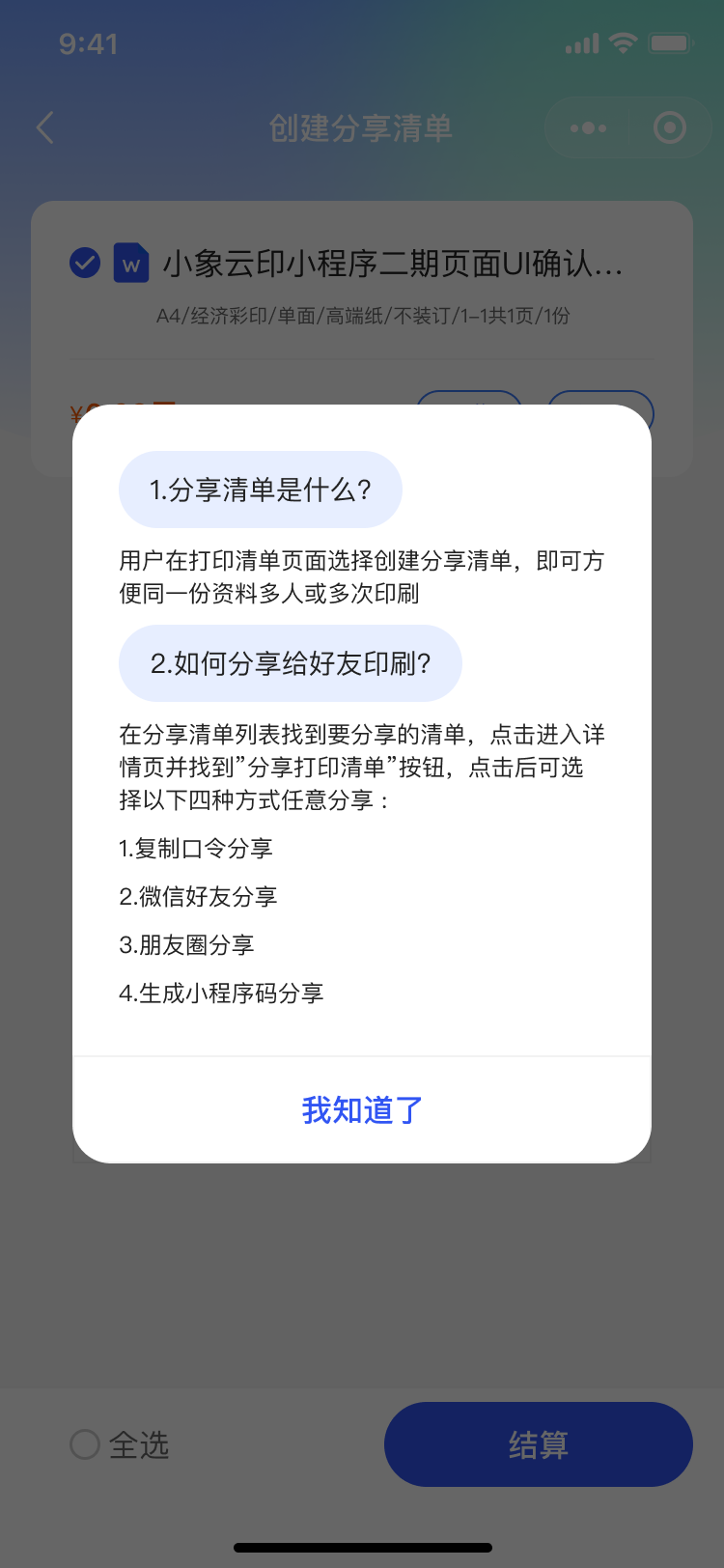 5. 跨平台分享功能:小象云印开发了便捷的分享功能,用户可以通过复制口令、微信好友分享、朋友圈分享、生成小程序码等多种方式,轻松将打印需求分享给他人,提高了用户体验。