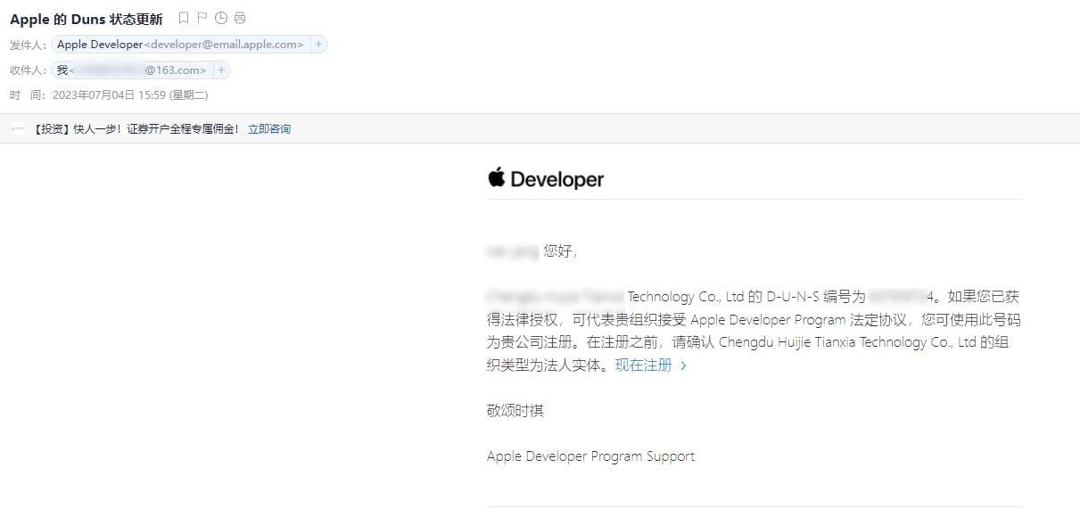 APP有两种身份的上架模式。一种是个人身份,另外一种是企业身份。如果是用企业身份申请上架,需要申请九位数的邓白氏编码。有时候苹果开发者官网申请邓白氏编码的链接打不开,就需要联系邓白氏中国区的代理公司,严格按照对方的邮件要求进行申请。下面是小火科技公司给客户申请邓白氏编码的截图: