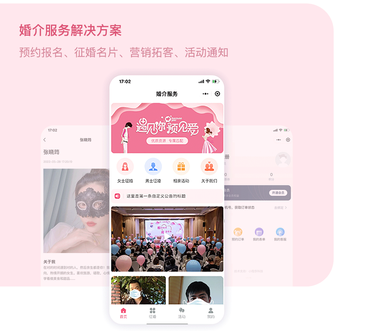 小火科技为小王提供了一个婚介小程序,通过这个小程序,他可以在一个交友联姻平台上寻找合适的伴侣。小程序包括女士征婚、男士征婚、预约报名、征婚名片、营销拓客、活动通知等栏目,让他能够方便地了解其他单身人士的基本信息,并主动发起约会。
