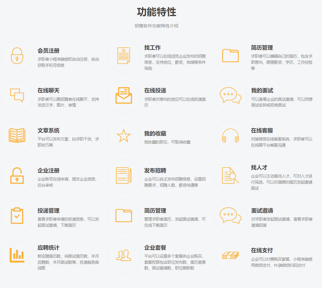 ng体育作为一家软件开发公司,从2013年成立至今,先后参与了数以百计的政企项目,我们对我们接手的每一个项目都高度重视,不管是大体量的项目,还是小程序、APP应用,我们都高度重视。今天给大家介绍一款招聘软件小程序,该招聘软件旨在为企业和个人提供便捷、高效的招聘服务。该小程序包含微信小程序求职者端、微信小程序企业招聘端、PC企业招聘端、PC管理平台端,涵盖了从求职者到企业的全方位招聘需求。下面是这款招聘小程序的主要功能,有相关需求的用户,请与我司交流。