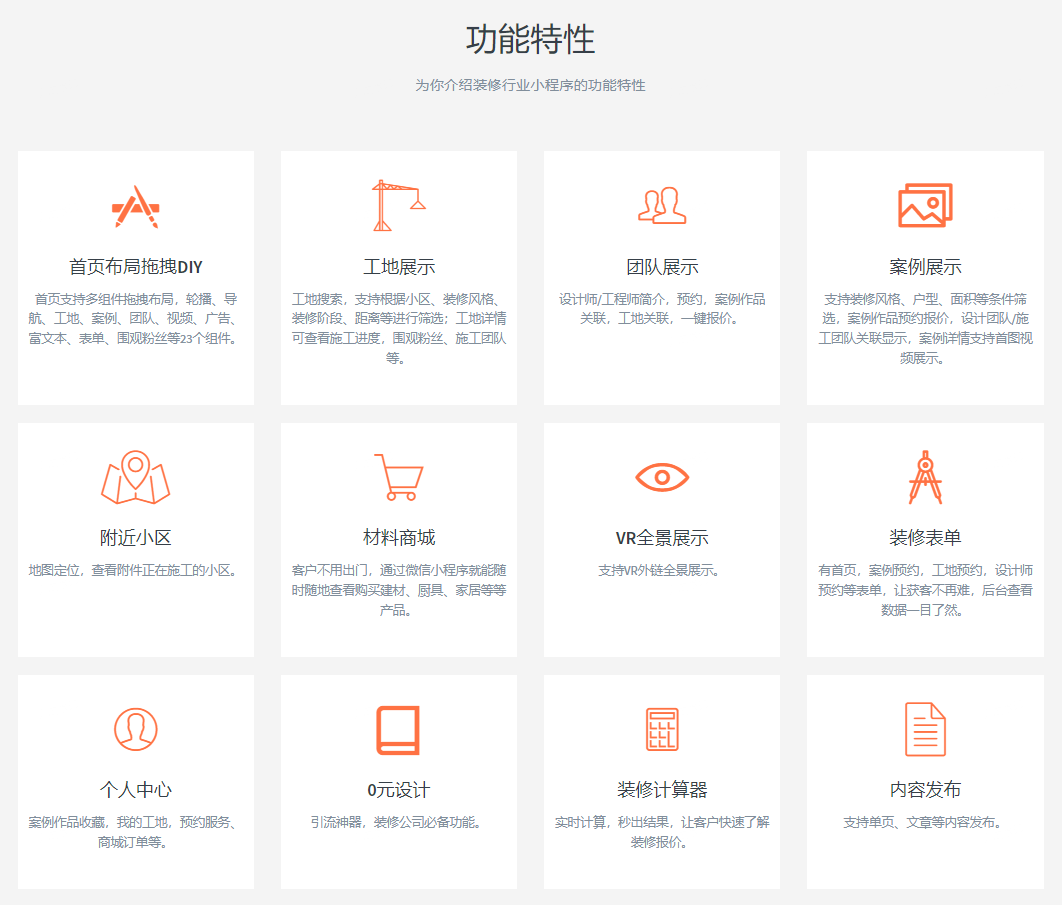 12. 内容发布:支持发布单页、文章等内容及自定义页面,公司可以发布装修知识、活动信息等内容,提供给用户更多的价值,同时也可以增加公司的曝光度和知名度。